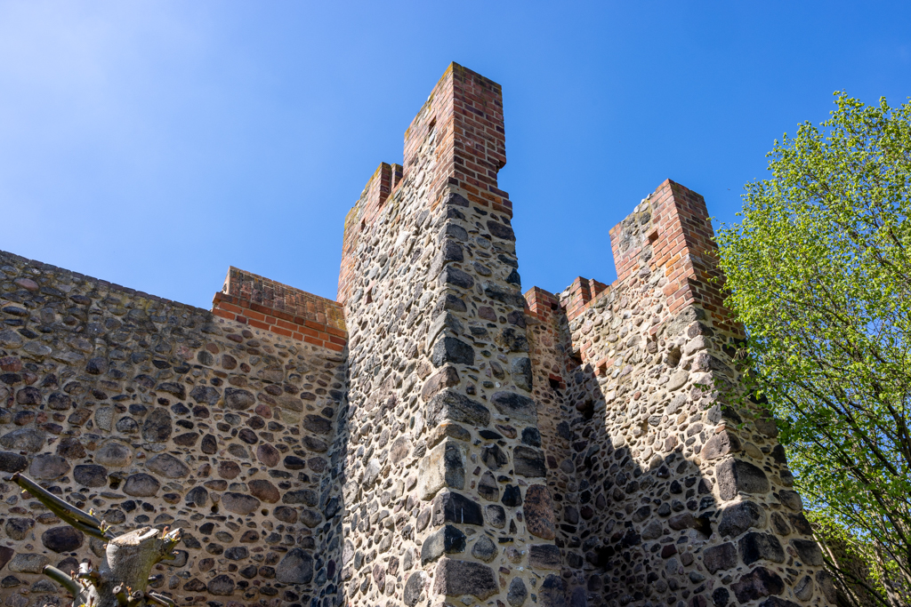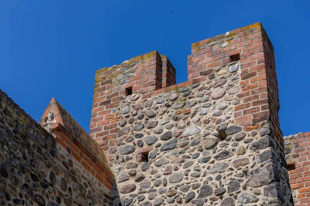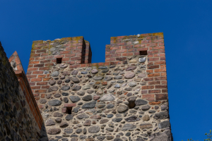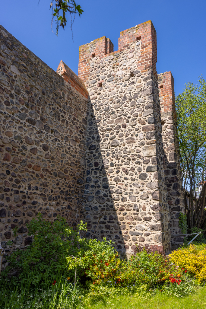 Eine weitere Aufgabe leitet sich aus dem Vorstehen der Wieckhäuser ab. Die Bauten waren nach innen offen, doch unter der Mauerkrone gab es eine hölzerne Plattform. Geschützt durch Zinnen konnten die dort wachenden Verteidiger in früheren Jahrhunderten aus erhöhter Position das Vorfeld der Stadtmauer einsehen. Eventuelle Angreifer am Fuß der Mauer bekämpften sie von oben herab mit Pfeil und Bogen oder der Armbrust. Wir müssen dazu wissen, dass es beim Bau der Stadtmauer Mitte des 13. Jahrhunderts noch keine Feuerwaffen oder Kanonen gab, mit denen Feinde die Stadtmauer und Verteidiger aus größerer Entfernung hätten bestreichen können.