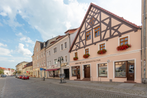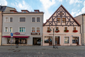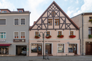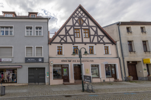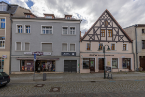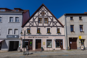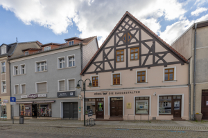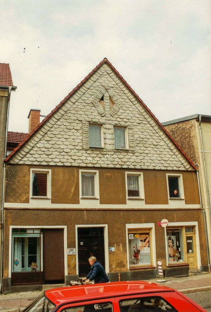 In eben diesem Jahr 1670 entstand als Fachwerkgebäude die heutige Große Straße 16. Vom Typus her handelt es sich um ein mitteldeutsches Mittelflurhaus. Erschlossen wurde das Grundstück über eine Zufahrt links vom Gebäude. Sie gehört heute zum benachbarten Grundstück Nr. 15 und wurde um 1850 überbaut. Im Gebäude befand sich eine Schwarze Küche und zum Hof hin eine Arbeitsstube. Die übrigen Räume waren der Wohnnutzung vorbehalten. Alte Quellen verweisen auf ein Renaissanceportal zur Großen Straße. Leider ging es wohl beim Umbau der Straßenfront 1859 verloren. Es kann dies ein Hinweis sein, dass beim Bau 1670 noch wesentliche Teile des Erdgeschosses aus der Zeit vor dem Dreißigjährigen Krieg erhalten und in den Neubau einbezogen worden waren.