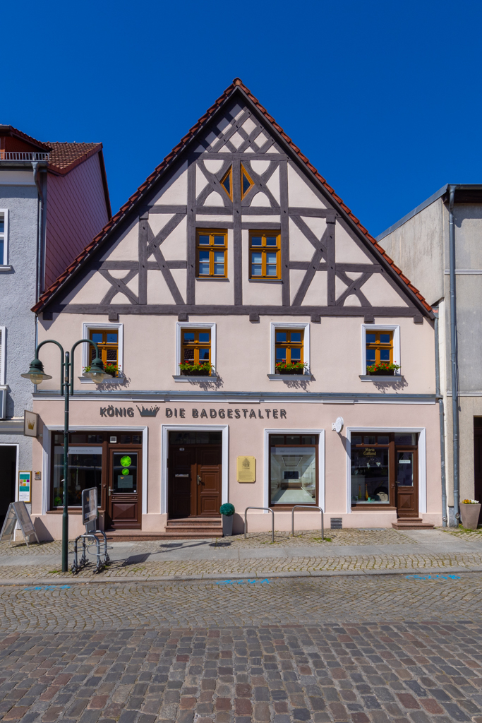 Schon auf den ersten Blick sticht das Gebäude Große Straße 66 aus der Bebauung der Altstadt heraus: Im Unterschied zu den Nachbarhäusern oder denen gegenüber präsentiert sich das historische Haus stolz mit seinem Fachwerkgiebel zur Straße.