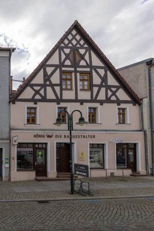 Anders als die meisten Nachfolgebauten in der Altstadt wurde der Giebel mit seinen Andreaskreuzen und dem Bauerntanzmotiv als Sichtfachwerk gestaltet. Üblicherweise entstanden zwar alle Neubauten nach dem Dreißigjährigen Krieg als Fachwerkgebäude. Doch nach dem Motto „Mehr Schein als Sein“ wurde das Fachwerk dort verputzt, um optisch als Ziegelbau zu wirken. Ziegelbauten konnten sich nur wohlhabende Bürger leisten und davon gab es in Strausberg nur wenige. Der eigentliche Wiederaufbau von Strausberg begann mit kurfürstlichen Subventionen erst um 1700. In den drei Jahrzehnten dazwischen war die Maßgabe durchgesetzt worden, alle Gebäude in der Stadt traufständig zu errichten. In diesem Fall grenzen nämlich die Nachbargebäude mit ihren Giebeln als einer frühen Form von Brandwänden aneinander. Das hemmte in der Folge die Ausbreitung von Bränden über ein ganzes Stadtgebiet erheblich.