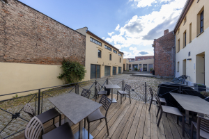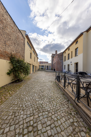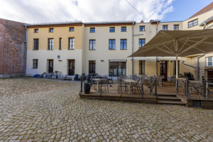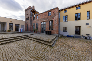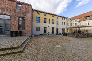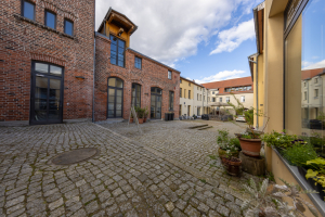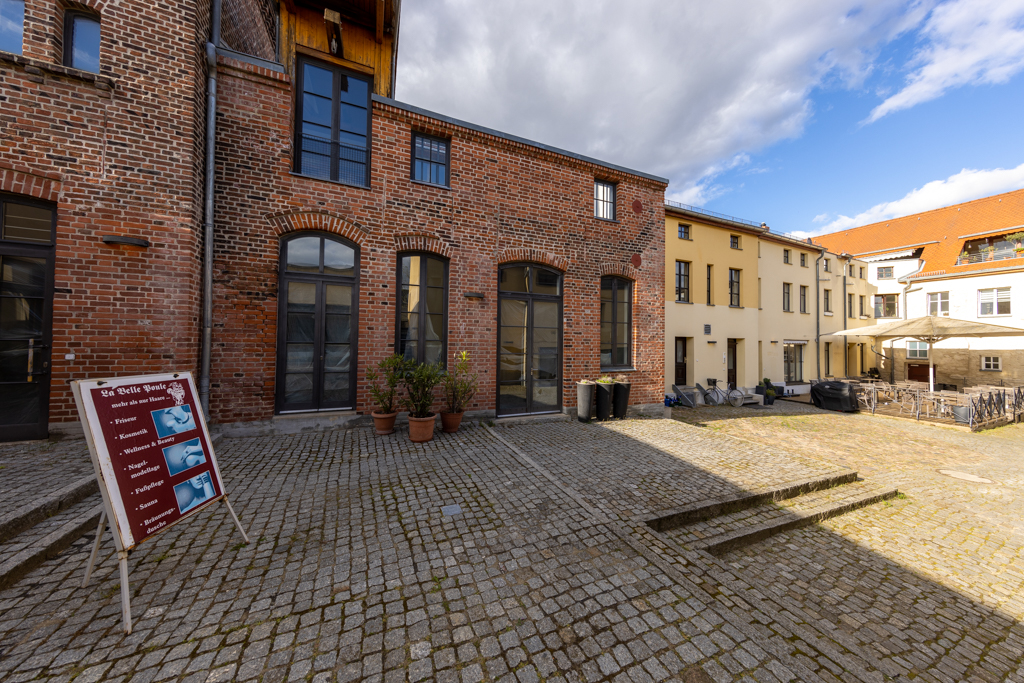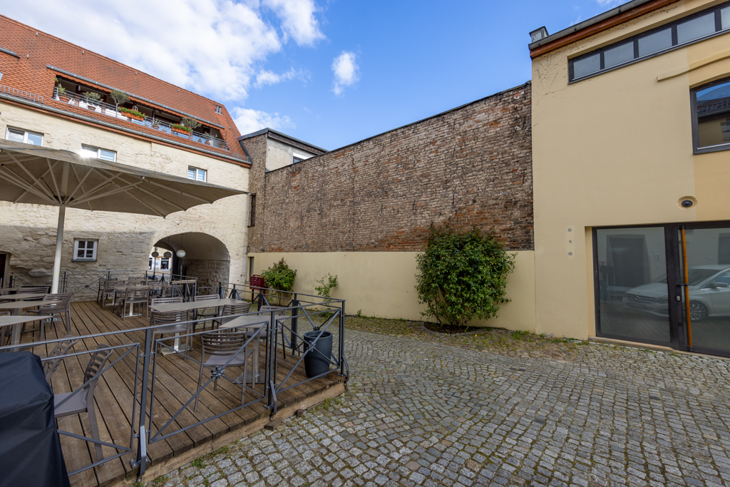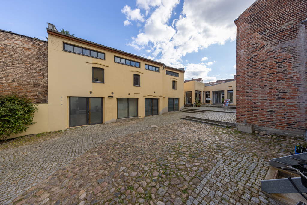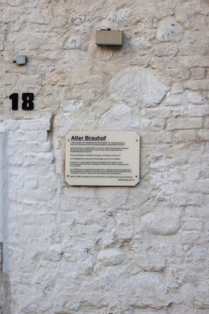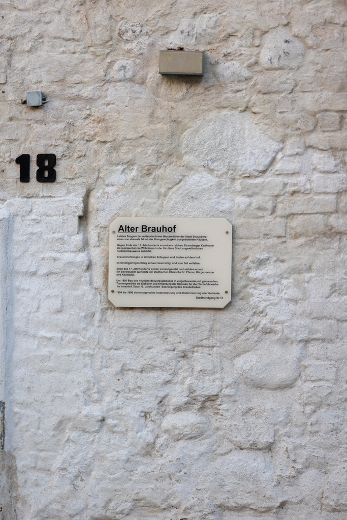Beim Durchgang in den gepflasterten Hof sticht vor allem das ziegelsichtige, turmartige Brauereigebäude ins Auge. Das den Baukörper nach oben abschließende Konsolgesims akzentuiert die sparsame Fassadengliederung des Dreigeschossers. Neben dem Brauereigebäude wird der Hof von einem Wohnflügel und Remisen gerahmt. Über einen ziegelsichtigen Zugang ist ein aus drei Tonnen gewölbter Eiskeller zu erreichen. An die lange Brauereigeschichte des Grundstücks erinnert hier der Name F. Weichser und die Jahreszahl 1881. Dieser Brauereibesitzer bewirtschaftete die Große Straße 18 von 1865 bis 1890. Einst gab mehrere Dutzend mit der Braugerechtigkeit privilegierte Grundstücke in der Stadt!