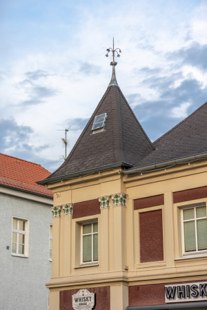 Der Turm erhielt dabei ein Zeltdach, während das übrige Gebäude von einem Walmdach bedeckt ist. Das Obergeschoss sticht zu beiden Straßenfronten mit seinem Stuck hervor, während die Bossierung im Erdgeschoss entfernt wurde. Auch die beiden kleinen Balkone, die dem Türmchen auf alten Aufnahmen zur Großen wie zur Müncheberger Straße im Obergeschoss zur Zierde gereichten, sind verloren gegangen.