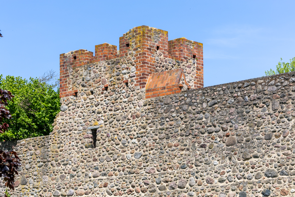 Der Bau der Befestigungsanlage war eine ebenso existenzielle wie fordernde Aufgabe, zu der damals alle Bürger herangezogen worden sind. Nach außen wurden besonders behauene oder glatte Feldsteine verwandt. Das hinderte Angreifer, die sieben Meter hohe Mauer zu erklimmen. Welche Sorgfalt die Bewohner damals aufbrachten, beweist der Bestand des Bauwerks über beinahe acht Jahrhunderte! Die Wallstraße erinnert mit ihrem Namen daran, dass hier vor Mauer und Tor eine in die Tiefe gestaffelte Wehranlage bestand.