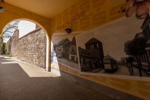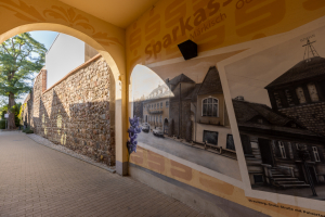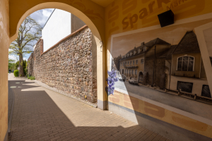 Im Rahmen der Städtebauförderung begann hier im Jahr 1995 die Sanierung der mittelalterlichen Stadtmauer von Strausberg. Bei diesem ersten Bauabschnitt beteiligte sich die Sparkasse Märkisch-Oderland als Anrainer an den Baukosten. Neben den quaderförmigen Bausteinen sind hinter dem Durchgang durch das Sparkassengebäude als Besonderheit an der Mauerkrone Schießscharten zu erkennen. Inzwischen konnte mit dem 14. Bauabschnitt auf der Ostseite der Altstadt die Sanierung der Stadtmauer abgeschlossen werden. Das baukulturell so wichtige Zeugnis der Strausberger Baugeschichte erscheint damit für die Zukunft gut gesichert. Es liegt jedoch in der Natur der Dinge, dass unsere Stadt auch in Zukunft in der Erhaltung und Pflege des Baudenkmals gefordert sein wird.